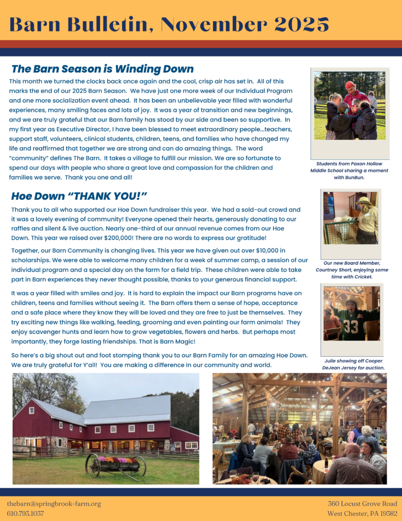 We are happy to present to you, our newsletter: The Barn Bulletin